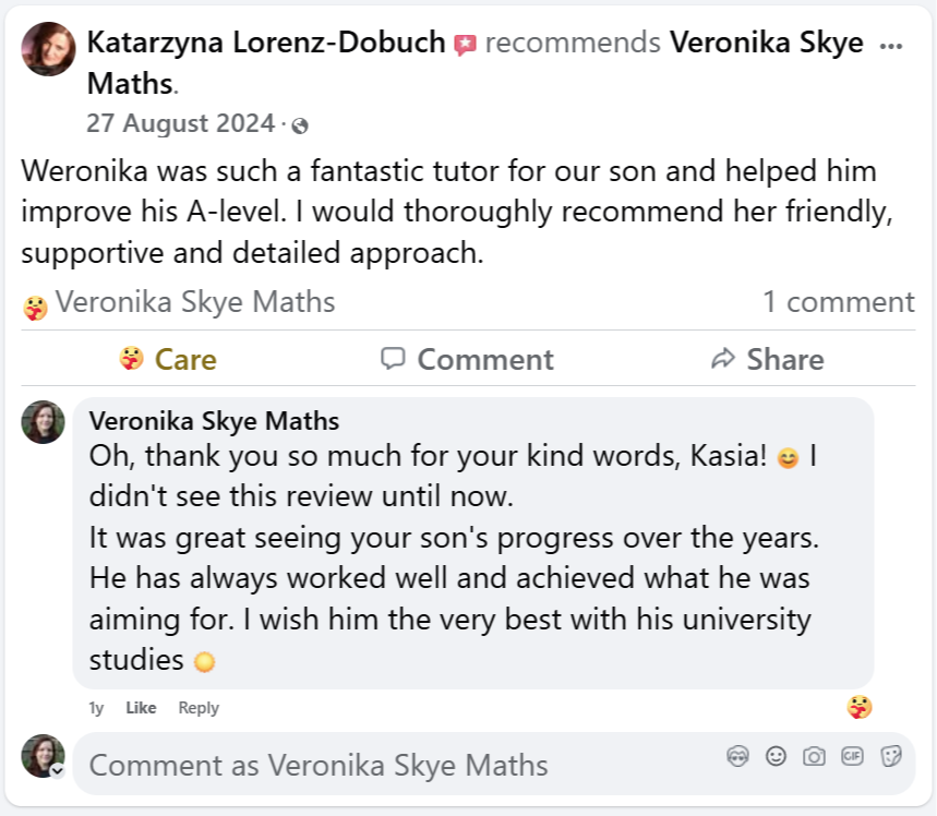 I’ll be more than happy to give her a recommendation to anyone, who needs maths tutoring. I got contact on Veronika also through my mother’s friend. She had a great experience with Veronika’s tutoring of her daughter.